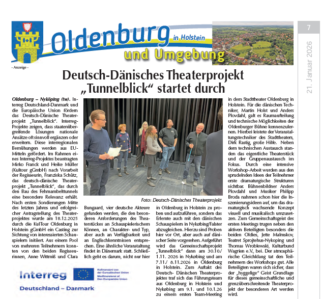 Sammen med borgere fra begge lande skabes et teaterstykke. Produktionen udvikles af instruktøren Anne Wittmiß på vegne af KulTour Oldenburg in Holstein gGmbH i samarbejde med Sprøjtehus Teatret i Nykøbing/Falster og den lokale instruktør Clara Bungaard.